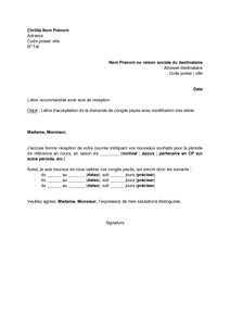 Lettre d'acceptation, par l'employeur, de la demande de congés payés avec modification des dates