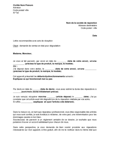 Lettre de demande de remise en état au réparateur pour détérioration de l'appareil confié