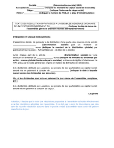 Vous êtes gérant d'une société à responsabilité limitée, vous pouvez réunir l'assemblée générale ordinaire de façon extraordinaire afin de distribuer exceptionnellement des dividendes par des prélèvements sur les réserves. Vous devez présenter aux associés le texte des résolutions en vue de leur adoption par l'assemblée générale. Ce texte des résolutions doit être rédigé préalablement à la tenue de l'assemblée générale, en listant les résolutions qui seront proposées aux associés en vue de leur adoption. Ces résolutions doivent suivre l'ordre du jour tel qu'il a été communiqué aux associés avec la convocation à l'assemblée générale.